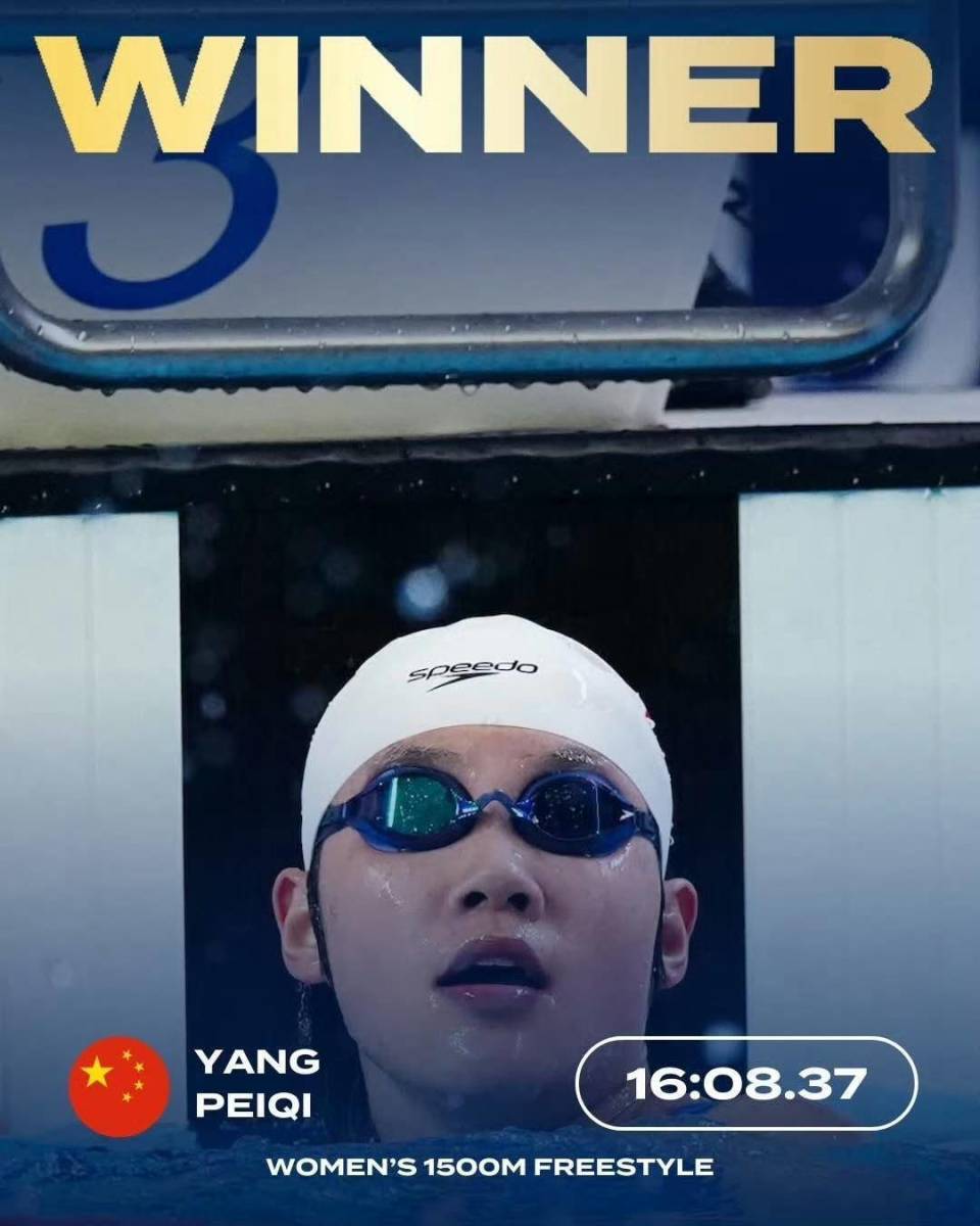 作为长距离项目,女子1500米自由泳项目根据运动员报名成绩,将参赛选手分为两个慢组和一个快组进行角逐,一枪决出名次。连续作战的杨佩琪继续化身为“劳模”,在前900米采取跟游战术,然后与对手交替领先,直到最后100米全力冲刺,很快甩开对手近3个身位,以16分08秒37的成绩为中国队摘得本次比赛的第四金,同样也是她个人第四金。